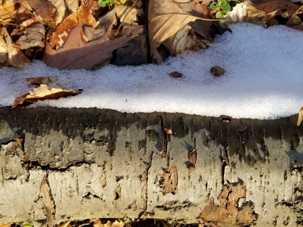 leaves and log with snow, Theodore Roosevelt Island