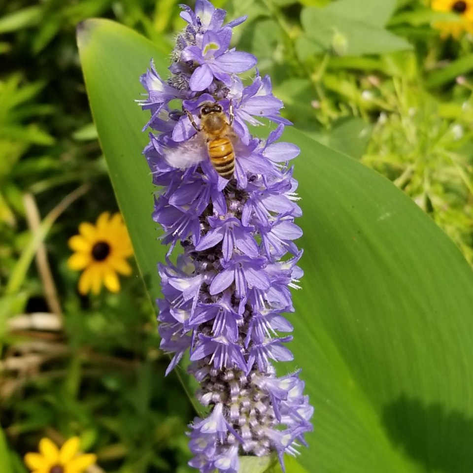 bee-on-pickerel-weed-regional-garden-u.s.-botanic-gardens-copyright-lynda-terrill